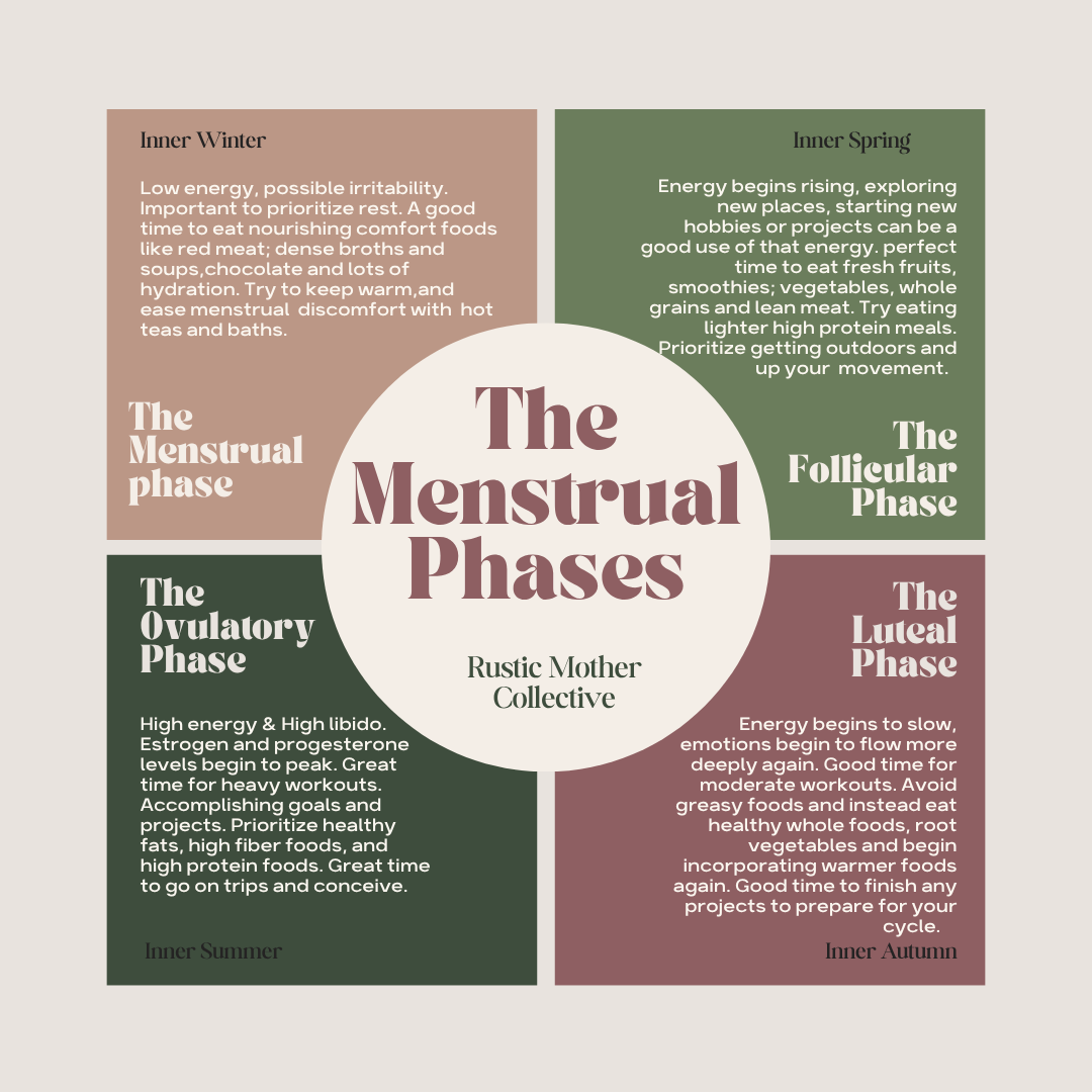 Respect your body by respecting this natural rhythm. Our cycle has four distinct phases. Our hormones ebb and flow throughout the 28 to 35 day cycle. Our hormones shift and change which means we may need more rest and have less energy during our menstrual phase. Our libido, and our overall physical energy may increase during our ovulatory phase. We may have specific nutritional needs throughout each of these phases. Lean into this unique experience of womanhood and honor your body's subtle cues. Each phase has their own energetic flow and differences. Here they are below.